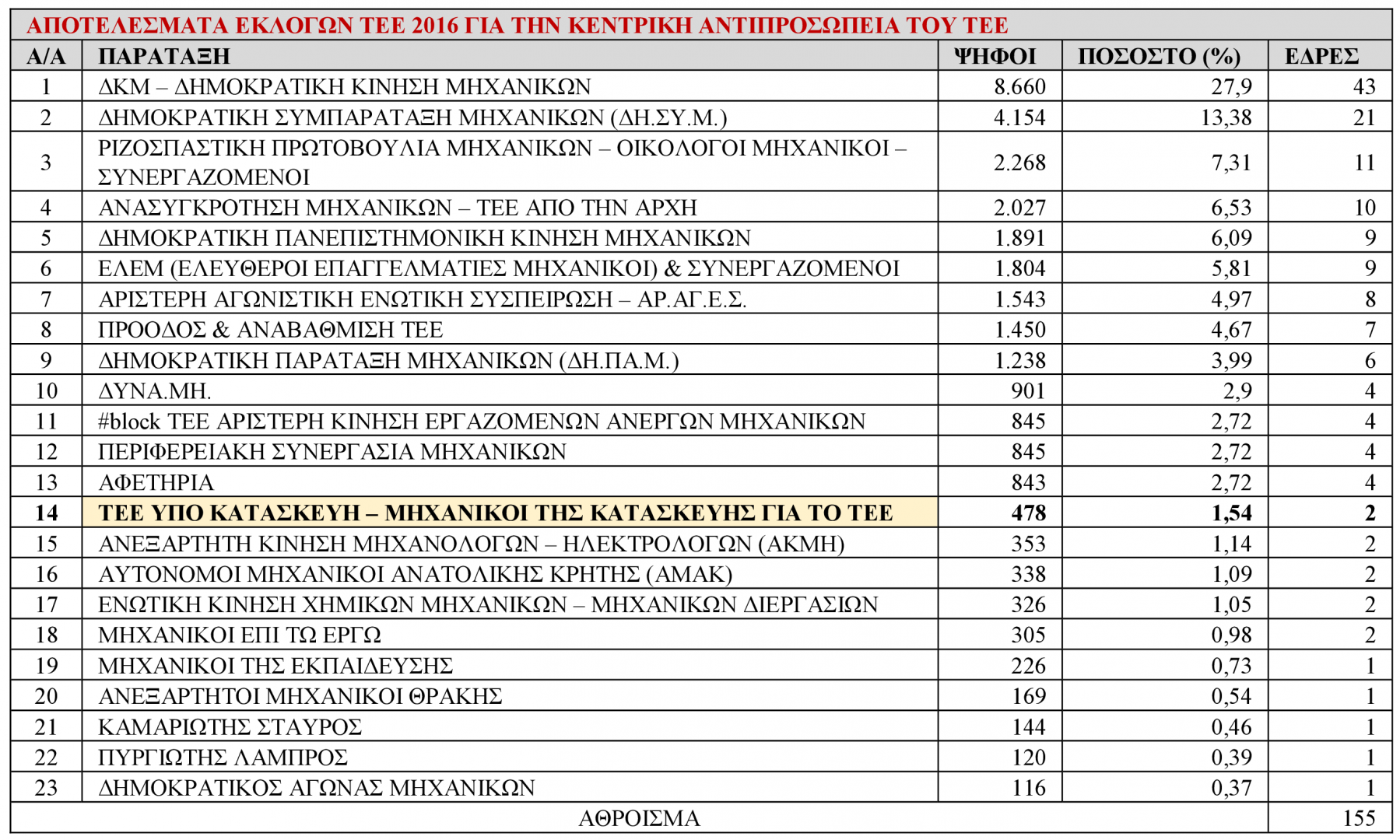 Αποτελέσματα Εκλογών ΤΕΕ 2016 για την Κεντρική "Αντιπροσωπεία Τ.Ε.Ε." - Τα αποτελέσματα του συνδυασμού "ΤΕΕ υπό κατασκευή - Μηχανικοί της Κατασκευής για το ΤΕΕ"