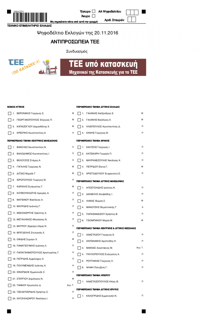 Κατατέθηκε την 11/10/2016 το ψηφοδέλτιο "ΤΕΕ υπό κατασκευή - Μηχανικοί της Κατασκευής για το ΤΕΕ" με υποψηφίους για την "ΑΝΤΙΠΡΟΣΩΠΕΙΑ ΤΕΕ", το κεντρικό όργανο του Τεχνικού Επιμελητηρίου.