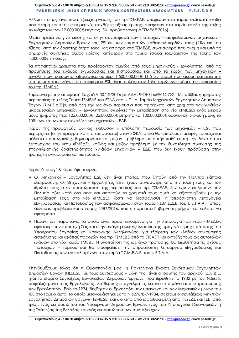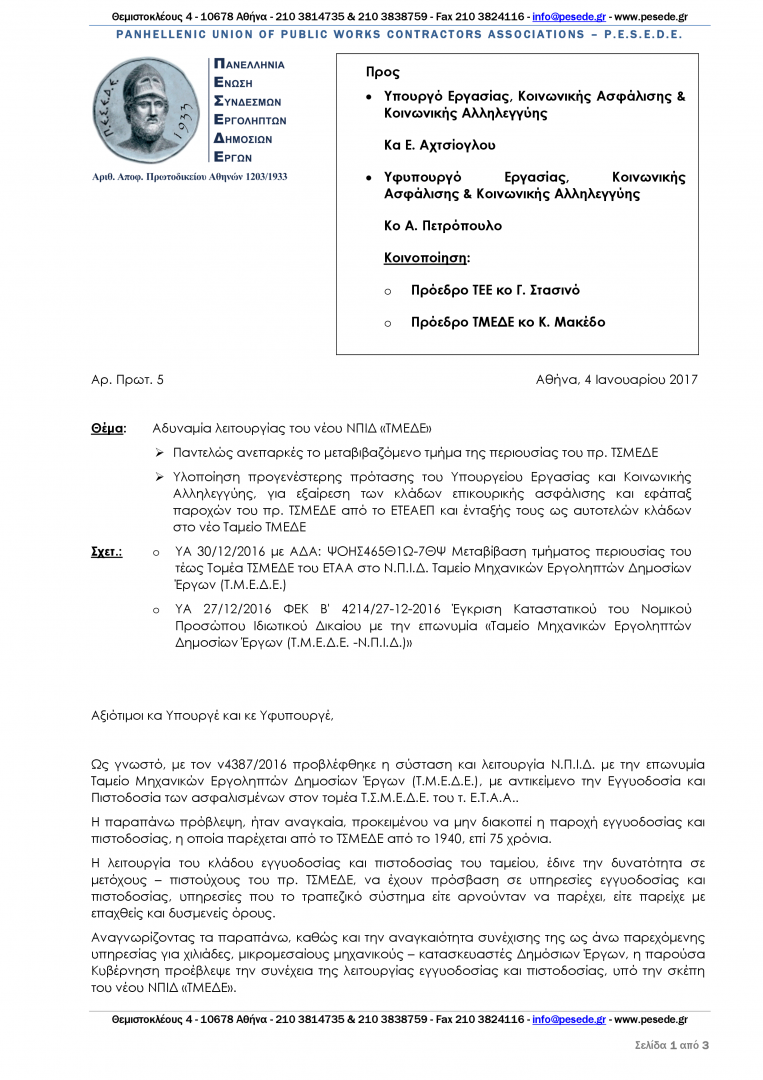 ΠΕΣΕΔΕ: Επιστολή προς την Υπουργό ΕΚΑΚΑ για την λειτουργία του ΤΜΕΔΕ - Αδυναμία λειτουργίας του νέου ΝΠΙΔ «ΤΜΕΔΕ»