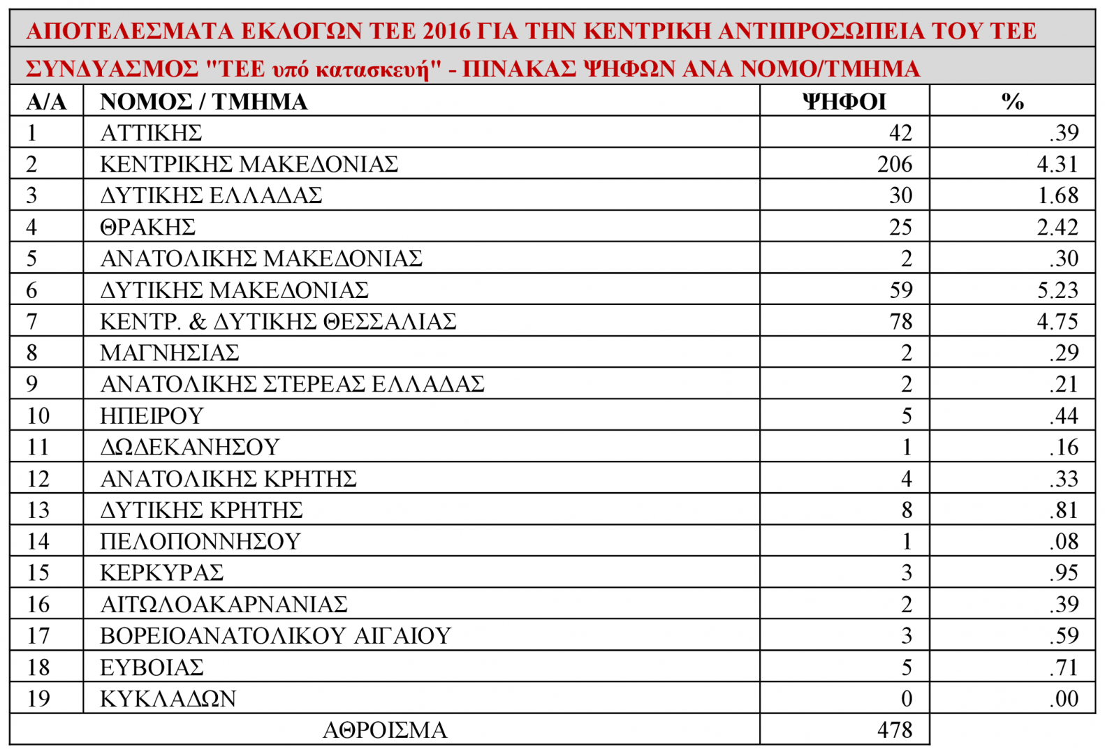 Αποτελέσματα Εκλογών ΤΕΕ 2016 για την Κεντρική "Αντιπροσωπεία Τ.Ε.Ε." - Τα αποτελέσματα του συνδυασμού "ΤΕΕ υπό κατασκευή - Μηχανικοί της Κατασκευής για το ΤΕΕ"