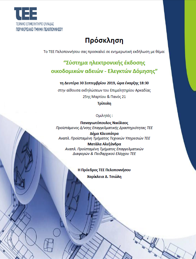 ΤΕΕ-Περιφερειακό Τμήμα Πελοποννήσου: Πρόσκληση σε ενημερωτική εκδήλωση με θέμα "Σύστημα ηλεκτρονικής έκδοσης οικοδομικών αδειών - Ελεγκτών δόμησης"