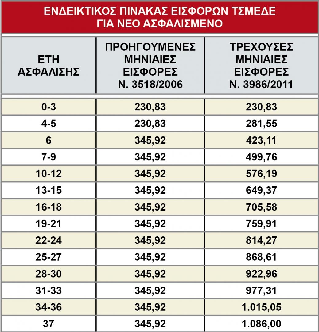 Πριν από την εφαρμογή των αυξήσεων που νομοθετήθηκαν με το νόμο 3986/2011 (Μεσοπρόθεσμο), είχαν καταστεί ανασφάλιστοι το 50% των αυτασφαλισμένων. Είναι ενδεικτικό το ύψος των εισφορών που υποχρεώνεται να πληρώσει ο εργαζόμενος με Δελτίο Παροχής, ο αυτοαπασχολούμενος και ο άνεργος για το διάστημα της ανεργίας του, τόσο πριν, όσο και μετά την εφαρμογή των αυξήσεων το 2014 (βλέπε Πίνακα)