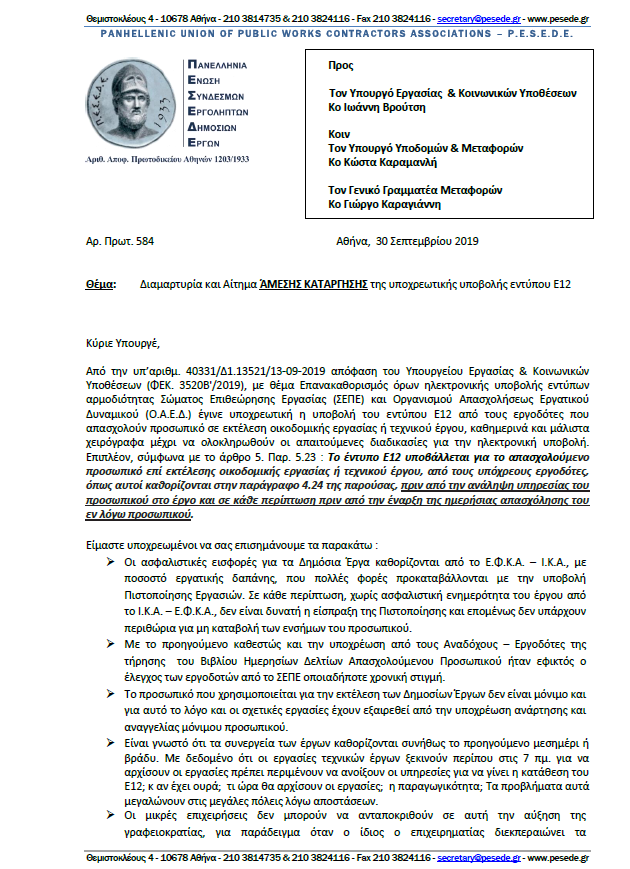 Επιστολή - Διαμαρτυρία της ΠΕΣΕΔΕ, προς τον Υπουργό Εργασίας & Κοινωνικών Υποθέσεων, με θέμα "Διαμαρτυρία και Αίτημα ΆΜΕΣΗΣ ΚΑΤΑΡΓΗΣΗΣ της υποχρεωτικής υποβολής εντύπου Ε12."