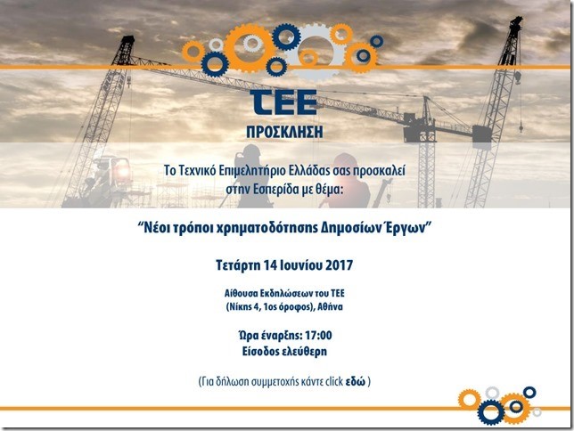 ΤΕΕ: «Νέοι τρόποι χρηματοδότησης Δημοσίων Έργων», Εσπερίδα στις 14 Ιουνίου 2017 στην Αθήνα