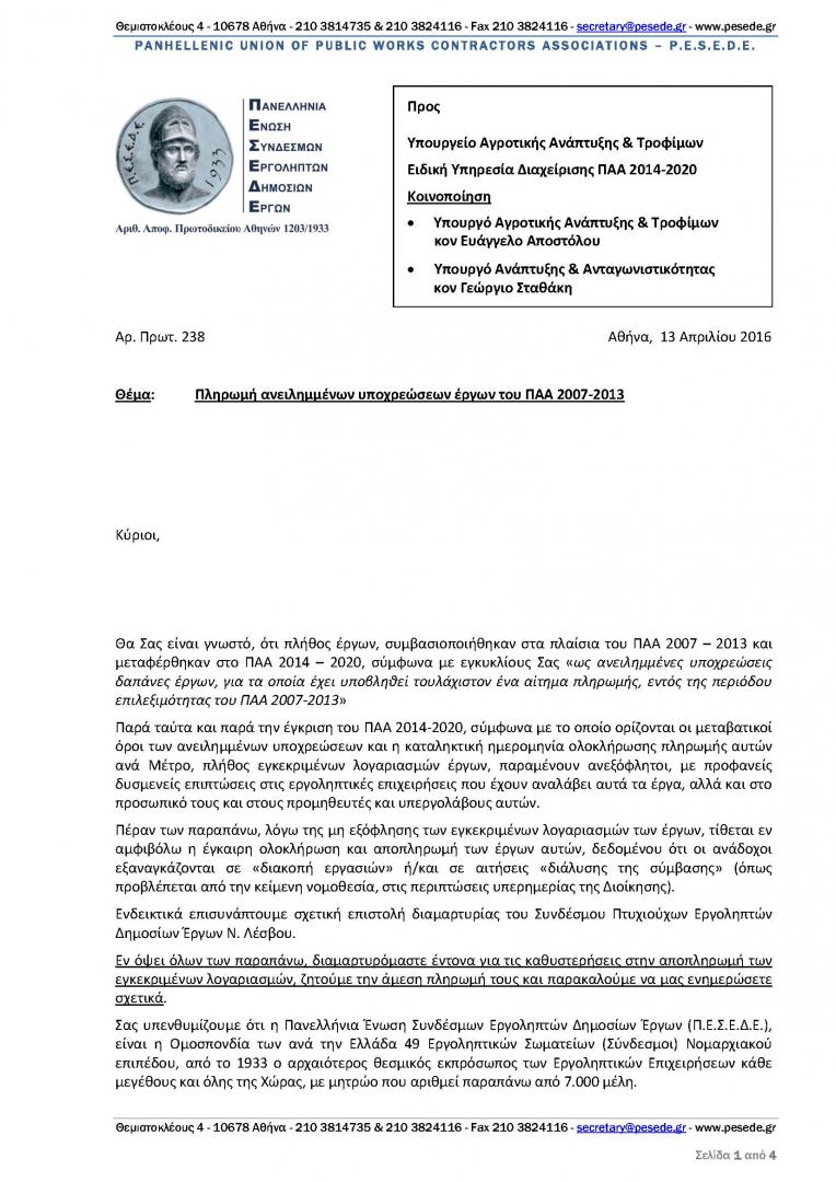 Επιστολή της ΠΕΣΕΔΕ προς το Υπουργείο Αγροτικής Ανάπτυξης & Τροφίμων Ειδική Υπηρεσία Διαχείρισης ΠΑΑ 2014-2020 με θέμα: "Πληρωμή ανειλημμένων υποχρεώσεων έργων του ΠΑΑ 2007-2013"