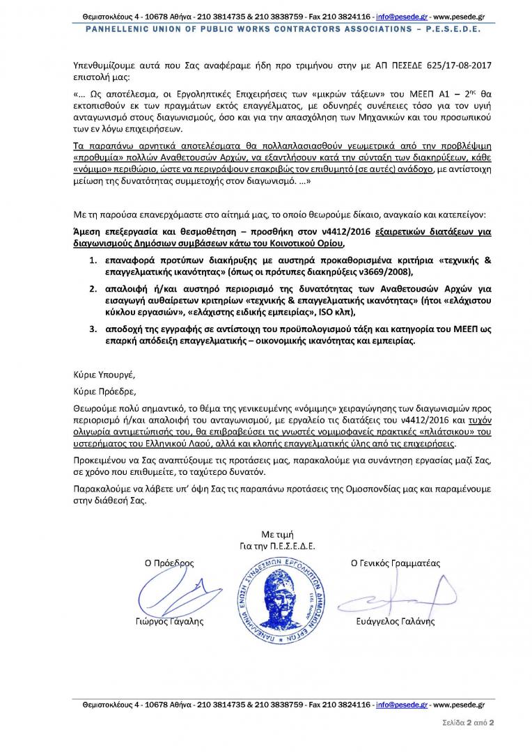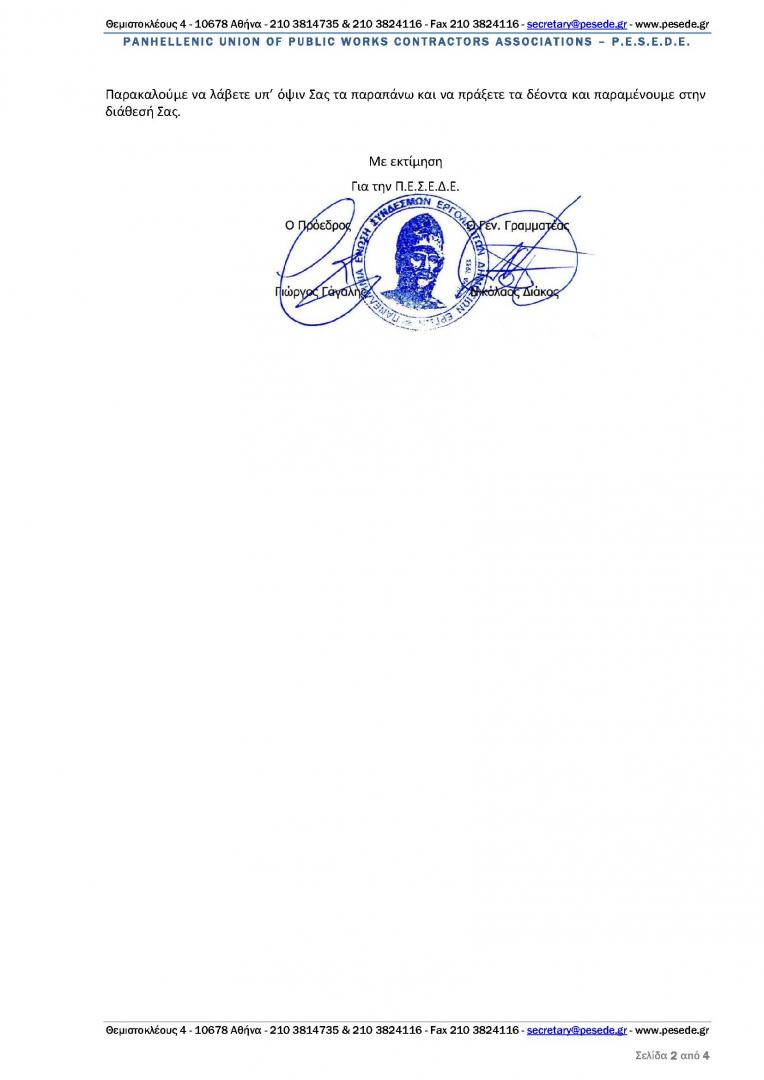 ΠΕΣΕΔΕ:Υπόμνημα - Αίτημα Τροποποίησης της παρ.2 του Άρθρου 103 του Ν.4412/2016 Αποκλεισμός αναδόχων και τιμωρία με κατάπτωση εγγυητικών συμμετοχής κατά παραβίαση της αρχής της αναλογικότητας
