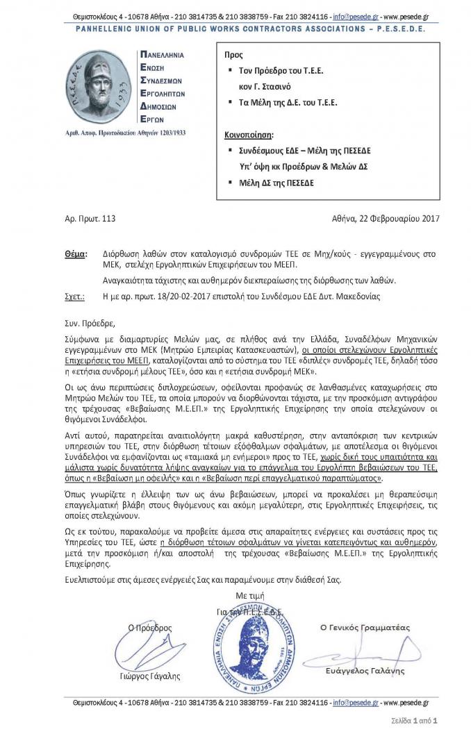 ΠΕΣΕΔΕ: Διόρθωση λαθών στον καταλογισμό συνδρομών ΤΕΕ σε Μηχ/κούς - εγγεγραμμένους στο ΜΕΚ, στελέχη Εργοληπτικών Επιχειρήσεων του ΜΕΕΠ