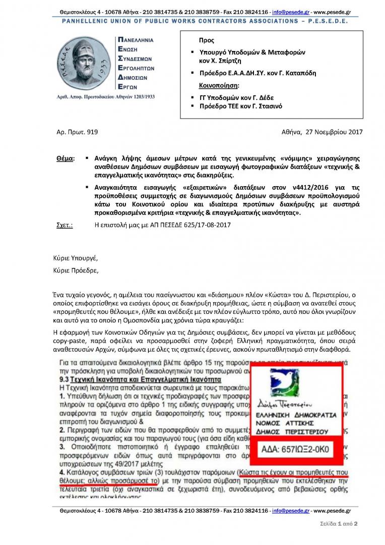 Ανάγκη λήψης άμεσων μέτρων κατά της γενικευμένης «νόμιμης» χειραγώγησης αναθέσεων Δημόσιων συμβάσεων. Επιστολή της ΠΕΣΕΔΕ προς τον Υπουργό ΥΜΕ και τον Πρόεδρο της ΕΑΑΔΗΣΥ